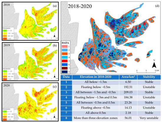 Elevation zone results and stability determination results for the 2018–2020 study area. ((a–c) Zone results for DEM elevation values for each year; (d) sandbank stability determination results for the study area; the table in the lower right corner shows the meaning and area of the values in (d)).