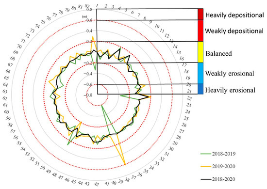 In this study, tide level data (http://global-tide.nmdis.org.cn/, accessed on 7 February 2022) were collected from Dafenggang, Jianggang and Yangkougang from June 2018 to January 2019. The tidal reconciliation constants were calculated based on the principle of tidal harmonic analysis [34] to calculate the tide level at the moment of remote sensing image collection. The tide level calculation results had good accuracy. In addition, hydrological data, such as sand concentration, sedimentation rate and flow velocity, were obtained from the hydrological test reports of the study area so that the thickness of erosion or deposition was calculated using semitheoretical formulas.