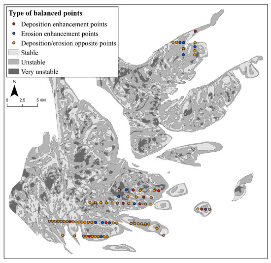 Classification results for the impact of persistent siltation at the balance points (the differently coloured points represent the types of balanced points; the colour of the study area represents the stability of the topography).