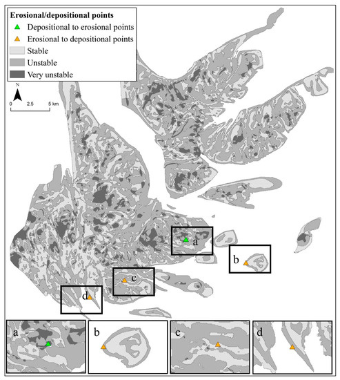 Distribution of erosional/depositional points (the differently coloured triangles represent erosional/depositional points) ((a–d) are the specific locations of the points).