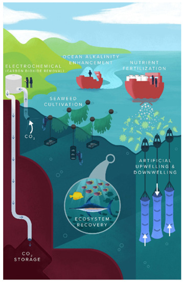 Strategies for ocean CO2 removal. Credit: National Academies of Sciences, Engineering, and Medicine. 2021. A Research Strategy for Ocean-Based Carbon Dioxide Removal and Sequestration. https://doi.org/10.17226/26278 (accessed on 9 February 2022). Reproduced with permission from the National Academy of Sciences, courtesy of the National Academies Press, Washington, DC, USA.