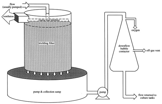 Schematic representation of the trickling filter used in RASs. Figure reprinted from [53]. Copyright (2000) Aquaculture Engineering on Science Direct. Licensed under CC BY-NC-ND 4.0.
