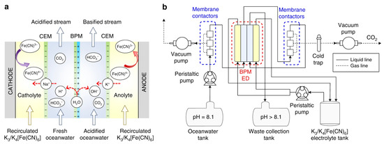 Figure reprinted from [62]. Copyright (2020) Nature Communications. Licensed under Creative Commons Attribution 4.0 International Public License. (a) Schematic drawing of seawater in a BPMED cell. (b) Process flow diagram of experimental setup for CO2 extraction from seawater.