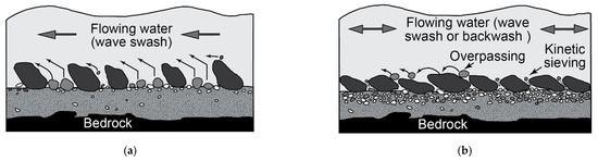 Conceptual models for the development of armoring on gravel or mixed sand-gravel beaches. (a) Segregation and armoring caused by a differentiation by clast shape and size during wave swash, followed by inverse grading due to progressively declining flow driven by infiltration of backwash (modified from Hayes and Michel [5]. (b) Armoring caused by storm wave swash flow over a mixed beach composed of clasts with different thresholds for movement (modified from Hayes and Michel [2,15]). In this case, intermediate-sized and some small clasts are removed from the upper bed of the intertidal beach by wave swash, whereas some small clasts are shielded by clasts which are too large to be moved. After initial armoring, further protection is driven by overpassing (intermediate-sized clasts bounce over armor and continue up-beach) and kinetic sieving (filtering of smaller particles into the interstices of larger particles) during both wave swash and backwash. Armoring may be a product of both models.