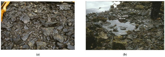 All beaches in this region are geologically “young”: most of the modern intertidal zone was shifted into its current vertical position through uplift of up to 11 m or several meters of downthrust associated with the 1964 Great Alaska Earthquake; many others were heavily disturbed by the ensuing tsunami [25]. Many of the gravel beaches of PWS were further artificially disarranged following the March 1989 EVOS. The discharge of 41 million liters of crude oil near the entrance to the Valdez Arm of PWS resulted in oiling of more than 780 km (~16%) of the intertidal zone in central and western PWS [26], an estimated 24% of which was characterized by heterogeneous gravel beaches [27]. A common post-spill cleaning method employed was high-pressure/hot-water (HP/HW) washing, during which sediments were flushed with ~60 °C water applied at 50–120 psi and 950–1900 liters per minute. This often extended into the biologically productive lower intertidal zones, and commonly resulted in the removal of fine sediments (sand, silt, and clay) from shallow beach sediments and disrupted the orientation of large clasts on these beaches (DCL, pers. obs.; Figure 3).