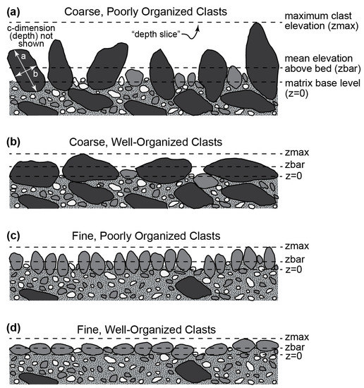 This conceptualization highlights the importance of accounting for clast size in characterizing surficial organization, thereby allowing for meaningful inter-site comparisons regardless of bed clast size. In his analysis of streambeds, Wolman [29] used measurements of the b-axis of individual clasts to characterize the diversity in surficial clast sizes. This axis provides a measurement for large clasts that is analogous to mean grain size (Mz) for the bulk sediment as measured through sieve analysis. In contrast, the level of organization of clasts in a bed is predominantly a function of the orientation of the longest (a) axis of the large clasts: the longer the clasts, the greater maximum surface rugosity in a fully disorganized bed (Figure 4, top panel). We thus consider the average length of the long-axis of clasts in a given plot (abar) to provide the most suitable measure by which to account for clast-size variability.