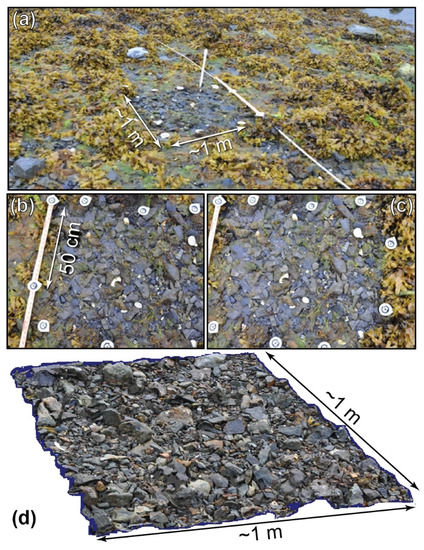 A series of high-resolution stereophotograph pairs was taken of each plot (e.g., Figure 5) using a Nikon D90 camera with a 20.0-mm lens specially calibrated for working with the PhotoModeler ScannerTM (EOS® Systems Inc., Vancouver, BC) software package. Paired photos were offset laterally by <50 cm. These pairs were taken from at least two angles and elevations from each side of a given plot to ensure all visible surfaces of each clast were photographed. This provided stereophoto pairs from a variety of orientations (Figure 5b,c). A series of 5–10 stereo pairs was collected from each plot. Generally, plots dominated by coarser-grained gravel required a greater number of photos than those with finer clasts due to the number of orientations needed to capture the three-dimensional morphology of larger cobbles and boulders.