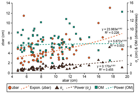 Surficial sediment organization represents the degree to which surface clasts are oriented in their most kinetically stable state. At maximum organization, the long (a) and wide (b) axes of large clasts are parallel to the surface of the bed and the shortest (c) axis is oriented orthogonally to the bed slope. The farther clasts protrude from the surface of the beach matrix, the more likely that those clasts are out of their most stable position; that is, the less organized the surficial sediment. This measure could be characterized by the range of “elevations” above the matrix bed level (z values), quantified as the mean z value (zbar) or—following Nikora et al. [19]—the surface roughness (σz) of a given bed (Table 1). It follows that more highly organized surface sediments would, on average, have lower values of zbar and σz; that is, these would have a lower average elevation above the sedimentary matrix level and less elevation variability (Figure 4). The maximum value of zbar for a sediment plot would be approximately equal to the mean long-axis dimension of clasts within that plot (abar; Table 1) if (1) all large clasts were of similar size (same length of long [‘a’] axes), (2) those large clasts were all positioned with their long axes oriented perpendicularly to the beach slope, and (3) the base of the largest clasts were at the zero-elevation plane. This would represent the minimum theoretical degree of surface clast organization. At sites exhibiting progressively more organization, an increasingly greater percentage of clasts would have their long axis oriented closer to horizontal, and thus be in a more “stable” state.