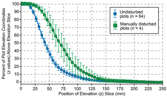 Results of Validation Test #1: comparison of the percentage of z-values extending varying distances above the standardized zero elevation for a given DTM for all undisturbed plots and four manually disturbed plots surveyed.