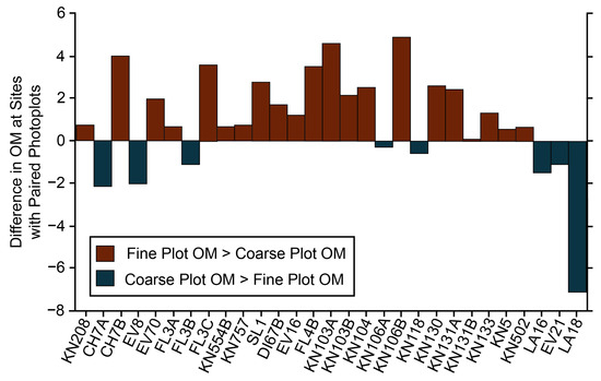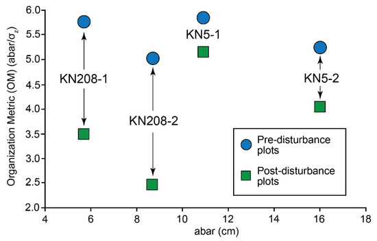 Our third field functionality test for OM compared pre and post-disturbance values for OM and σz for four plots that were manually disturbed with a shovel following the initial photo-documentation. We predicted that OM in the artificially disturbed plots would be lower than in those same plots prior to manual disturbance. Indeed, following disturbance, zbar increased 79% ± 51% (p < 0.0001; paired 1-tailed resampling comparison of means; mean σz also increased (52.0% ± 40.0%; p < 0.0001; Table 5) and mean OM decreased significantly (31.1% ± 8.7%; p < 0.0001; Figure 9). All three variables responded significantly to disturbance.