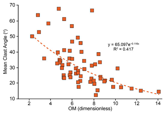 The calculated OM values for all sites ranged from 2.27 to 14.06 (Table 2; Figure 6), with a mean value of 6.89 ± 2.307. The OM values are independent of abar (p = 0.25). Thus, equal values of OM should indicate that the mean orientation (flatness) of the clasts relative to beach angle is similar at sites at which clast lengths differ substantially.