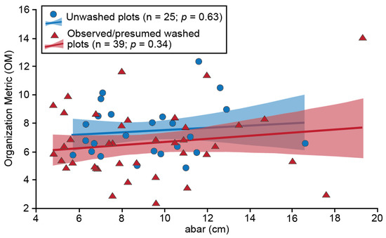 Notably, differences in abar between unwashed and O/P washed sites were not significant (p = 0.94; Table 7). This was predictable because large clasts likely would not be added or removed from an area by washing. It was unexpected that zbar was not significantly higher at O/P washed sites (p = 0.22). However, σz was significantly higher at O/P washed sites (p = 0.073) and OM was significantly higher sites at unwashed sites, as predicted above (p = 0.06).