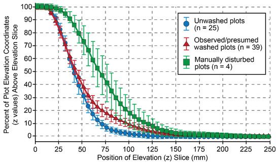 Comparison of the percentage of z-values extending varying distances above the standardized zero elevation for a given DTM for compiled unwashed, O/P washed, and manually disturbed (Validation Test #3) photoplots.