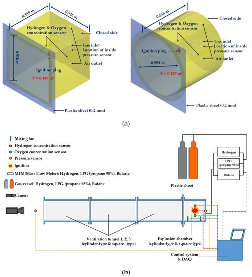 Schematic representation of the test facility; (a) explosion chamber (left: square-type, right: cylinder-type), (b) Test facility.