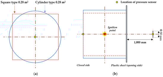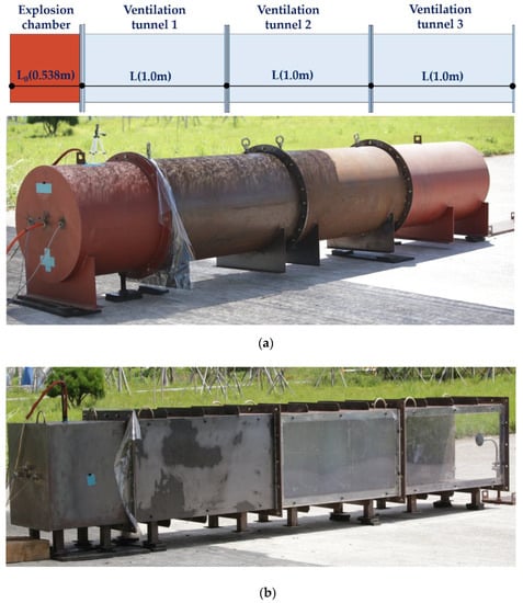 Figure 3a,b shows the cylinder- and square-type ventilation tunnel components, respectively, of which the ventilation tunnels were constructed. The square-type explosion chamber was manufactured with the same volume (0.149 m3) as that of the cylindrical explosion chamber, and a 10 mm polyacrylic window was installed to make the flame propagation visible from the side (Figure 3b).