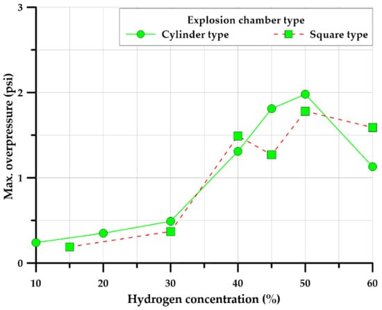 Hydrogen also exhibited explosion characteristics. It formed a higher explosive overpressure than hydrocarbon gases. Figure 24b shows the explosion overpressure for hydrogen. The average explosion overpressure of the square explosion chamber was 20.9 psi, which was 4.5 times that of the cylindrical explosion chamber (4.6 psi). In addition, during the experiment, the observation window on the side of the square chamber was damaged owing to the geometry-induced increase in the explosion overpressure, as the surface of the square explosion chamber was at right angles to the internal environment.