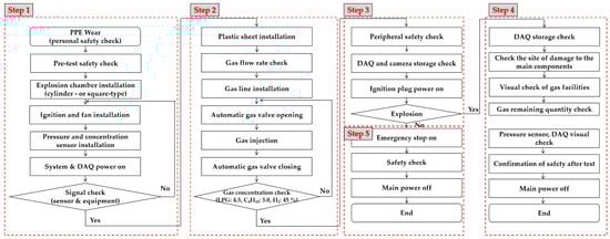 The experimental scenarios selected are described in Table 2. Additionally, the experimental test procedure was developed for safety and to obtain a valuable database, as illustrated in Figure 7. Step 1 was the preparatory work before the explosion experiment. The explosion chamber, densitometer, spark plug, and pressure sensor were installed inside the chamber, and power was applied to check the signal of each device. Step 2 was the process of preparing the explosion environment inside the explosion chamber. To form a gas cloud, a plastic sheet was wrapped around the explosion chamber, and gas was injected to confirm the explosion target concentration. In Step 3, safety was verified in the environment around the explosion, and data logs and images were obtained. All preparations were verified, and the spark plug was ignited. Step 4 was the post-explosion process to check the pressure data storage status, check the safety of the explosion chamber and equipment, turn off the power, and end the explosion test. Step 5 was the case in which no explosion occurred: the power of all devices was cut off, the exhaust port was opened, and the trapped gas was discharged to the atmosphere.