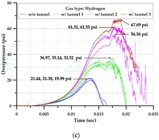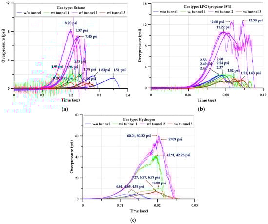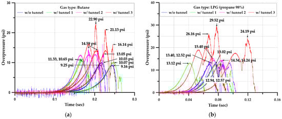 To distinguish and compare the hydrogen explosion characteristics from those of hydrocarbon-based gases (butane and LPG (propane 98%)), we investigated and analyzed the effects of the length and shape of the ventilation tunnel. Each gas was tested based on the concentration that formed the maximum explosive overpressure. Gas concentrations for the test condition were controlled at 4.5–5.0% of butane, 4.2–4.5% of LPG (propane 98%), and 45–50% of hydrogen, based on a preliminary test, as shown in Figure 6.