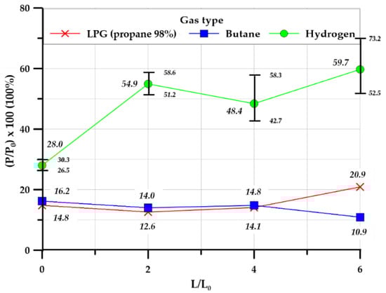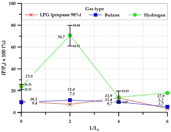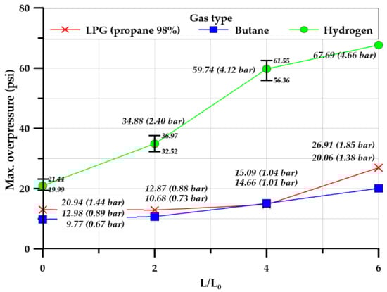 Figure 8 illustrates the time–pressure relationship measured inside the explosion chamber, as an average of three tests performed under the same conditions, for butane, LPG (propane 98%), and hydrogen. In the Figure 9, L/L0 represents the ratio of the length of the ventilation tunnel (L = 1.0, 2.0, 3.0 m) to the length of the explosion chamber (L0 = 0.5 m). For each gas, the average value of the maximum overpressure inside the chamber for the explosion chamber and tunnel combination was obtained. For the hydrocarbon-based gases (LPG (propane 98%) and butane), the pressure values at length ratios of 0 and 2.0 of the explosion chamber and tunnel (L/L0) were similar. When the length ratio was 4.0, the pressure rose to its highest value; when the length ratio was 6.0, the pressure was smaller than that of the length ratio of 0. Similarly, in the case of hydrogen, the pressure rose as the length ratio increased to 4.0, then decreased until a length ratio of 6.0. Quantitatively, the maximum overpressure of hydrogen gas was more strongly influenced by the length ratio of the ventilation tunnel than were those of hydrocarbon-based gases.