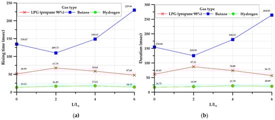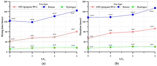 Figure 14a,b illustrates the rising time and duration against maximum overpressure, which are important characteristics indicating the behavior of the explosion load profile for each gas. The rising time is the time from the occurrence of overpressure until the maximum overpressure is reached. As the rising time is related to the load speed, it affects the strain rate of the structure subjected to the explosive load. The duration is a variable that affects the extent of impact generated by the explosive load. To ensure test usability and repeatability, the tests were performed three times for each case, and the average values of the rising time and duration were obtained. The rising time and duration increased in the order: hydrogen < LPG (propane 98%) < butane regardless of whether or not a ventilation tunnel was in place. For LPG (propane 98%) and hydrogen the rising time and duration were not strongly influenced by the length ratio of the explosion chamber and tunnel, whereas for butane these values increased as the length ratio of the explosion chamber and tunnel increased.