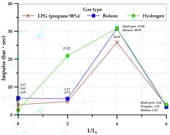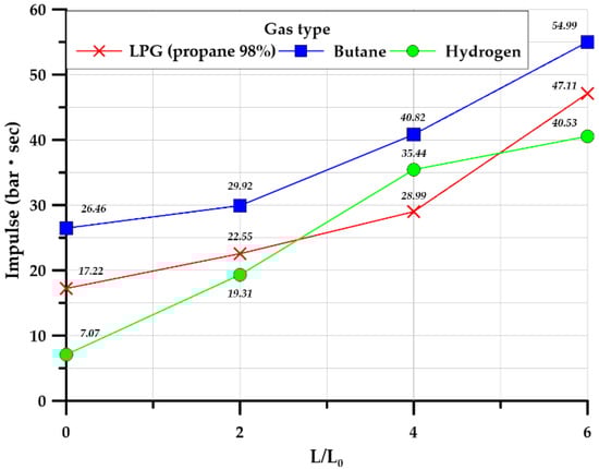 Figure 22 illustrates the average value of the impulse for three identical experiments. For all gases, as the length ratio of the explosion chamber and tunnel increased, the impulse also increased. The impulse was closely related to the duration and maximum overpressure. Butane, which had a relatively long rising time and duration, exhibited a larger impact than that of hydrogen, which had a significantly higher maximum overpressure.