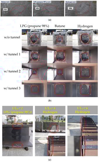 Figure 13a displays the plastic sheet rupture shape and area in the case without a tunnel. After the explosion test in the case with a tunnel, the plastic sheet ruptured because it was melted by the heat inside the chamber. As shown in Figure 13b, hydrocarbon-based combustible gases (LPG (propane 98%) and butane) exhibited an average rupture area of 607 and 234 cm2, respectively, and hydrogen exhibited an average rupture area of 1073 cm2.
