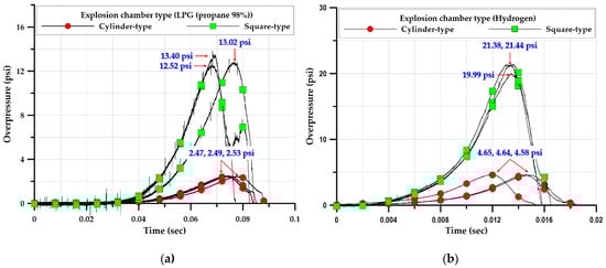 Comparison of explosion overpressure for explosion chamber geometry; (a) LPG (propane 98%), (b) Hydrogen.