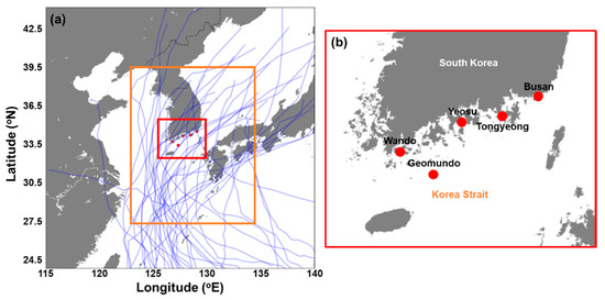 Study area. (a) Red and orange boxes indicate Korea Strait and domain area of Global Forecast System (GFS) data, respectively. Blue lines represent trajectories of typhoons (2010–2019). (b) Red dots represent the five tidal stations (Wando, Geomundo, Yeosu, Tongyeong, and Busan).