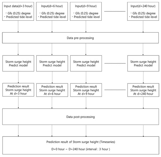 As instances of such damage have attracted attention, typhoon storm surges have become a major research topic in studies of maritime disasters. Furthermore, these incidents have highlighted the importance of research into typhoon storm surge forecasting as a method of advance preparation to reduce damage [8,9,10]. Most studies on typhoon storm surge forecasting have been based on purely data-driven models, empirical formula models, or dynamic numerical models [8,11]. Early studies used statistical models to analyze the complex and nonlinear relationship between tropical cyclones and storm surges [12,13,14,15,16]. More recently, research has been performed using dynamic numerical models that use weather data and typhoon forecast information such as typhoon path, central pressure, and wind speed to obtain more accurate forecasts. Existing studies have been used to compute results, such as coastal inundation prediction maps, but their practical use is limited by their low reproducible resolution and high computational demands [17,18]. Furthermore, they have not clearly revealed the physical mechanisms behind typhoon storm surges, such as atmosphere/ocean interactions, and their ability to provide forecasts that represent the dynamic effects of typhoons [9,18,19]. Chen et al. [9] reported that the existing studies have a limitation to predict the storm surge since it involves complex interactions with the atmosphere and ocean at various scales. Moon et al. [18] also inferred that predicting typhoon-induced sea state requires very intensive computations because it should be accomplished by a full coupling between a typhoon model and a surface wave model.