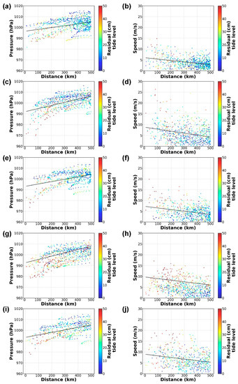 Correlations between air pressure (left column) and wind speed (right column) and distance from typhoon center from the observational data at (a,b) Busan, (c,d) Geomundo, (e,f) Tongyeong, (g,h) Wando, and (i,j) Yeosu during typhoons in 2010 to 2019.