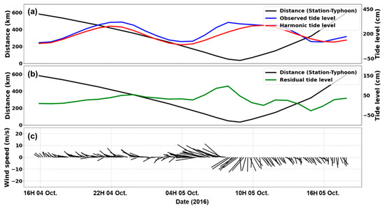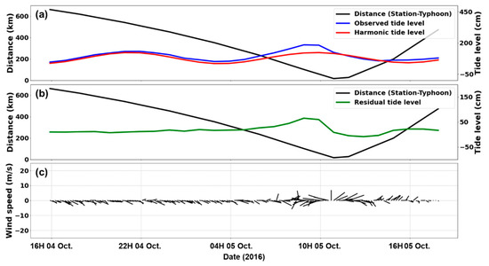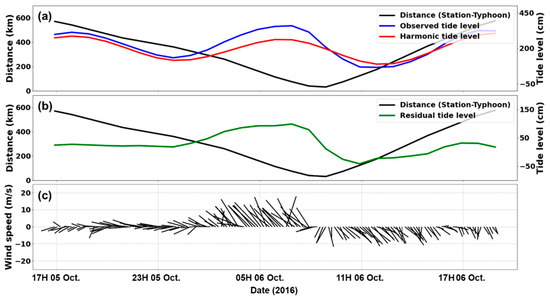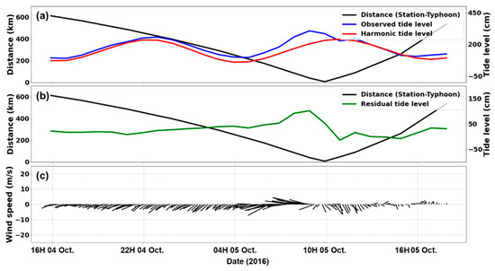Time-series of observational data from Busan tidal station during Typhoon Chaba. (a) Astronomical tide, (b) residual tide level, and (c) wind components, where direction and length indicate wind direction and speed, respectively.