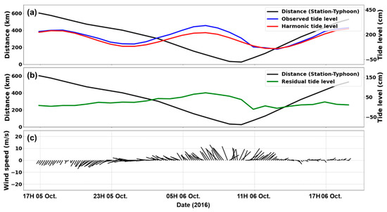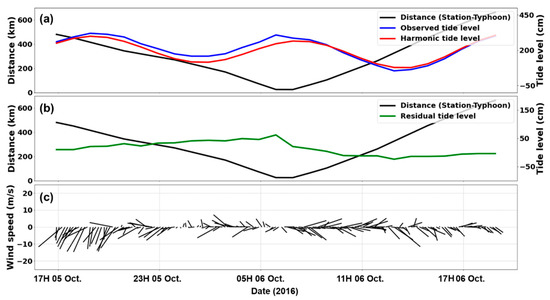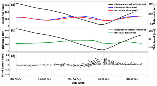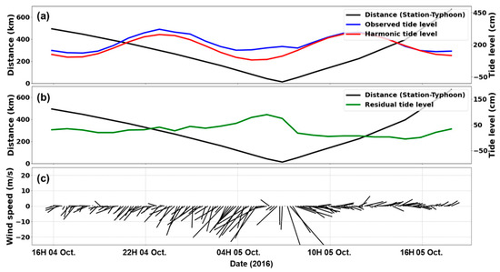 Time-series of observational data from Tongyeong tidal station during Typhoon Chaba. (a) Astronomical tide, (b) residual tide level, and (c) wind components, where direction and length represent wind direction and speed, respectively.