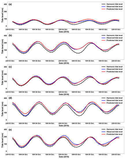Validation of trained model during Typhoon Chaba (2016). Time-series results for (a) Busan, (b) Geomundo, (c) Tongyeong, (d) Wando, and (e) Yeosu stations. Red lines are results predicted by the trained model. Blue and black lines show observed and harmonic tide levels, respectively, at the tidal station.