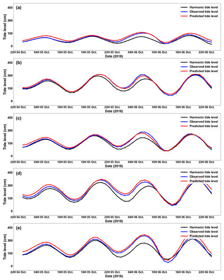The accuracy of the typhoon storm surge forecast model was validated at five points during the attacks of typhoons Chaba (2016) and Kong-Rey (2018). Figure 16 and Figure 17 show the harmonic, observed, and predicted tide levels for the two typhoon time periods as time-series. The seawater level periodicity and storm surge phenomena during the typhoon attacks were modeled well overall. In particular, the storm surge phenomena that occurred in conjunction with flood tide periods were modeled similarly to the observed tide levels. In addition, the modeled seawater level increase caused by typhoon attack during the ebb tide period was also consistent with the actual tide level (Figure 16b,d). The storm surge occurrence time periods were found to be accurately divided and modeled, although each of the five tidal stations had different results. Table 4 shows performance indices for the storm surge forecasting results at the five tidal stations, which were calculated as the absolute error, absolute relative error, and root mean square error (RMSE). The absolute deviation is the difference between the predicted tide level and observed tide level at the time of maximum residual tide level, and the absolute relative error is the absolute deviation ratio of the observed tide level. The relative deviation at the Tongyeong and Wando tidal stations during the Chaba (2016) attack period was more than 15%, whereas the other tidal stations showed relative deviations of 5% or less. When Typhoon Kong-Rey attacked, all five tidal stations showed a relative deviation of 5% or less. The RMSE was 15 cm or less at all tidal stations. Table 5 shows accuracy evaluation results, which are calculated using residual tide levels and predicted residual tide levels. Overall, it shows the correlation between 0.7 and 0.9, and it is confirmed that the model could be possible to predict the residual tide level similarly with the observed tide level.