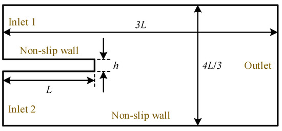 The two-dimensional computational domain designed in this paper is shown in Figure 1. In order to make the fluid fully developed before reaching the trailing edge, an area with a length of L = 0.3 m was reserved in the model. The total length of the computational domain was 3 L, the width was 4 L/3, and the thickness of the trailing edge of the hydrofoil was h = L/10. The two inlets on both sides of the hydrofoil were set as velocity boundary, and the inflow velocities were U1 and U2, respectively. The average velocity was Uin = (U1 + U2)/2 = 20 L/s. The Reynolds number, Re, with L and Uin as the characteristic length and the characteristic velocity, was about 1.8 × 106. The surface of the hydrofoil and the two sides of the channel were set as the non-slip wall, and the outlet was set as a static pressure boundary.