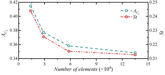 The planar quad elements were used to discretize the computational domain, and the elements on the surface and tail of the hydrofoil were refined, as shown in Figure 2. Four sets of grids with 13,866, 28,842, 58,050, and 135,014 elements were obtained, respectively. The vortex shedding frequency and lift coefficient amplitude of the case U1 = U2 = 20 L/s calculated by these four sets of grids were compared, and the results are shown in Figure 3. Here, the vortex shedding frequency, fv, was characterized by the Strouhal number, St. The lift coefficient amplitude, , referred to the amplitude corresponding to the dominant frequency obtained by the fast Fourier transform (FFT) of the lift coefficient, CL. CL and St were defined as: