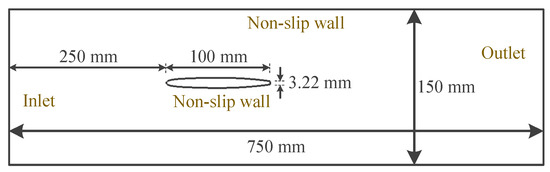 To verify the accuracy of the numerical model constructed in this paper, a more complex structure (i.e., a blunt-tailed NACA 0009 hydrofoil) was subjected to CFD analysis using the same turbulence model and a grid with a similar number of elements, and the computational domain is shown in Figure 4. The NACA 0009 is one of a series of foils designed by the National Advisory Committee for Aeronautics in the United States. Ausoni et al. [26] conducted a series of experiments on this foil in a water tunnel. Comparing the fv obtained by the numerical simulation and the experiment, the two results were highly consistent, as shown in Figure 5, indicating that the two-dimensional numerical model used in this paper can reliably predict the shedding process of the wake vortex.