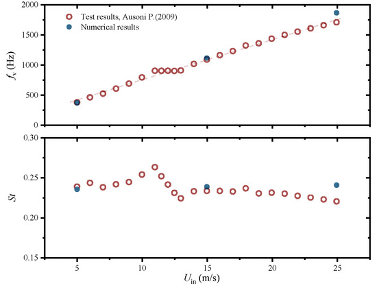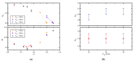 Firstly, Uin = 10 L/s and 30 L/s (i.e., Re ≈ 0.9 × 106 and 2.7 × 106) were set to simulate the effects of the Reynolds number on αc1 and αc2. Figure 9a shows the fluctuation amplitude and dominant frequency of the lift coefficient under different α, while Figure 9b shows the range of αc1 and αc2 under different Uin. Overall, the value of Uin had a negligible effect on and St. According to the definitions of and St, the amplitude of the lift acting on the hydrofoil was roughly proportional to the quadratic of Uin, and the vortex shedding frequency, fv, was approximately proportional to Uin.