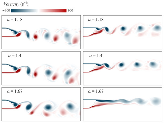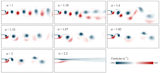 Figure 6 shows the contours of the vorticity downstream of the hydrofoil under various conditions. When 1 ≤ α ≤ 2, periodic shedding vortex street was observed. With the increase of α, the vorticity of the vortex located below the center line of the hydrofoil decreased rapidly, while the vorticity of the upper vortex changed relatively less. When 1 ≤ α ≤ 1.4, the shedding and development of the lower vortex was relatively complete, and the wake vorticity presented the most common form of the Karman vortex street. When 1.53 ≤ α ≤ 2, the upper vortex dominated the wake structure, and the lower vortex gradually disappeared. When α ≥ 2.2, two stable vortex regions were formed at the tail of the hydrofoil, and no alternate shedding vortex structure was observed.