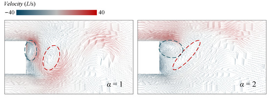 Figure 7 shows the velocity vectors downstream of the hydrofoil when α = 1 and α = 2, which represent the cases in the range of 1 ≤ α ≤ 1.4 and 1.53 ≤ α ≤ 2, respectively. For 1 ≤ α ≤ 1.4, the interaction between the upper and lower vortices was mainly reflected in promoting the formation of each other and pushing each other to develop downstream. When 1.53 ≤ α ≤ 2, the induced velocity of the upper vortex destroyed the further development of the lower vortex to a certain extent, and accelerated the formation of the next lower vortex. At this time, the wake had a higher stability.