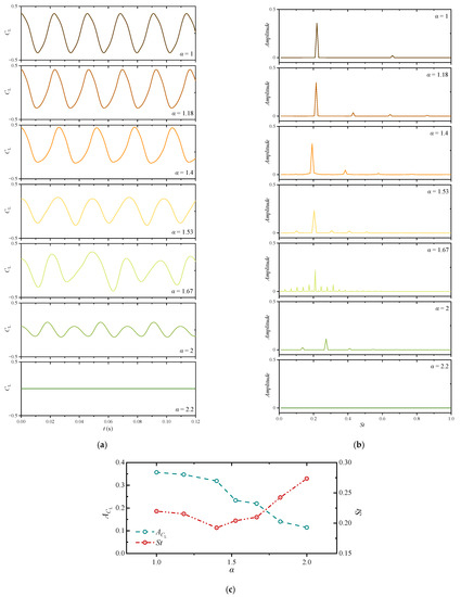 Lift coefficient of the hydrofoil under different α: (a) time domain plot, (b) frequency domain plot, and (c) values of and St.