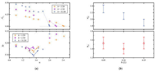 Experience has shown that in addition to Uin, the thickness of the trailing edge is also one of the key factors affecting the wake performance. Then, keeping Uin = 20 L/s, the trailing edge thickness, h, was changed to L/20 and 3 L/20, respectively, for simulation, and the results are shown in Figure 10. In general, with the increase of h, showed an increasing trend, while the change of St was more complicated. When α < αc1, the change of St was small as h increased. On the contrary, when α ≥ αc1, St increased first and then decreased. Among them, h = L/10 corresponded to the largest St, h = L/20 was the next, and h = 3 L/20 corresponded to the smallest. In this case, the trend of was equivalent to the trend of lift amplitude. That is, the larger h was, the larger the amplitude of the lift acting on the hydrofoil, indicating a greater intensity of the vortex. The magnitude relationship of St could not directly reflect the relationship between the vortex shedding frequencies with different h. After converting St to fv, it could be seen that fv decreased significantly with the increase of h.