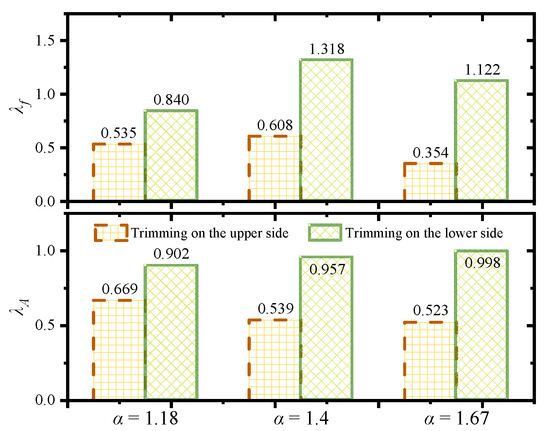 The corresponding λA and λf of the trimming under different conditions are shown in Figure 13. From the perspective of the change in amplitude, the trimming on the low-velocity side reduced the amplitude of the lift coefficient by more than 90%, and the larger the α, the better the effect. The effect of the trimming on the high-velocity side was poor, and the larger the α, the worse the effect. Judging from the change of the vortex shedding frequency, the λf corresponding to the low-velocity side trimming was higher. When α ≈ αc1, the corresponding λf was the highest, no matter which side was modified.