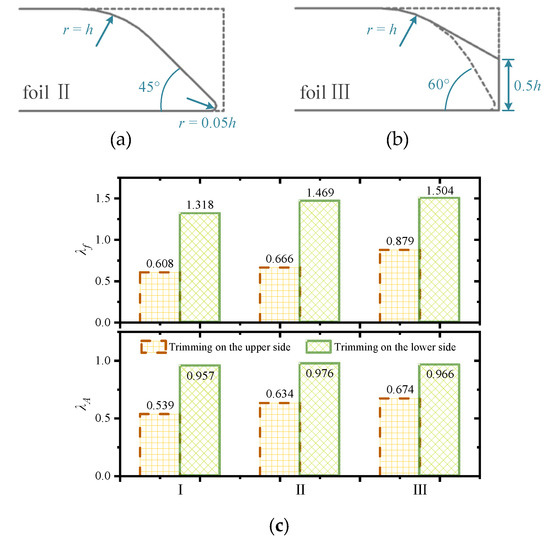 To verify the above conclusions, two additional beveled trailing-edge shapes were designed, as shown in Figure 14a,b. The hydrofoil corresponding to Figure 11 was named foil I. The trimming effects of these three trailing-edge shapes under the condition of α = 1.4 are shown in Figure 14c. The results showed that, for this type of flat foil, trimming on the low-velocity side always suppressed the Karman vortex better. It was also found that the effects of trimming in different ways on the vortex strength and shedding frequency significantly differed. However, this was not the focus of this paper, so it was not repeated here.