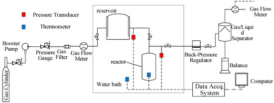 Figure 1 shows the schematic of the experimental apparatus. The apparatus has been detailed and introduced in our previous study [22]. The core component of the device is a high-pressure reactor (20 MPa) with an internal volume of 56.91 cm3. The reactor and the supply vessel are immersed in a water bath. The circulation fluid of the water bath is the mixture of deionized water (75 wt%) and ethylene glycol (25 wt%) The pressures in the reactor and supply vessel are measured by two pressure transducers (±0.025 MPa). The temperatures inside the reactor and water bath are measured by Pt100 temperature sensors (±0.1 K). The pressure of the reactor outlet is controlled by a back pressure regulator. The pressure and temperature are monitored and recorded by a data acquisition system.