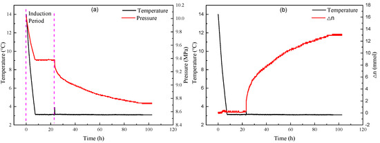 Typical hydrate formation curve. (a) Pressure and temperature evolution of methane hydrate formation. (b) Methane consumption and temperature evolutions of methane hydrate formation.