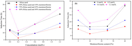Comparison of induction time. (a) Induction time under different NaCl concentrations. (b) Induction time under different montmorillonite contents.