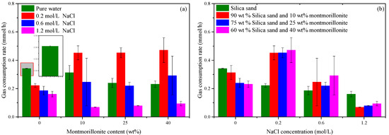 Summary of gas consumption rate. (Error bars represent the experimental deviation). (a) Gas consumption rates under different NaCl concentrations. (b) Gas consumption rates under different montmorillonite contents.