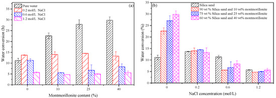 Summary of water conversion. (a) Water conversion under different NaCl concentrations. (b) Water conversion under different montmorillonite contents.