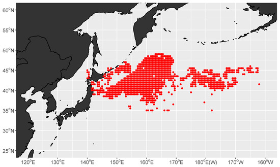 The neon flying squid (Ommastrephes bartramii), the main fishing target of squid-jigging vessels in the North Pacific Ocean, is an economically important oceanic cephalopod species [1,2]. O. bartramii is an essential and important component of marine food webs and serves as a predator of numerous small species and a crucial prey species for numerous large marine organisms [3]. Therefore, it is extremely important to understand the spatial–temporal distribution and sustainable utilization of O. bartramii resources for ecosystem protection. The neon flying squid distribution and relative abundance are closely linked to changes in environmental conditions. Numerous studies have found that the potential fishing grounds of O. bartramii in the North Pacific were largely influenced by marine environmental variables such as sea surface temperature (SST), sea surface salinity (SSS), chlorophyll-a concentration (Chla) and sea surface height (SSH) [4,5,6,7,8].